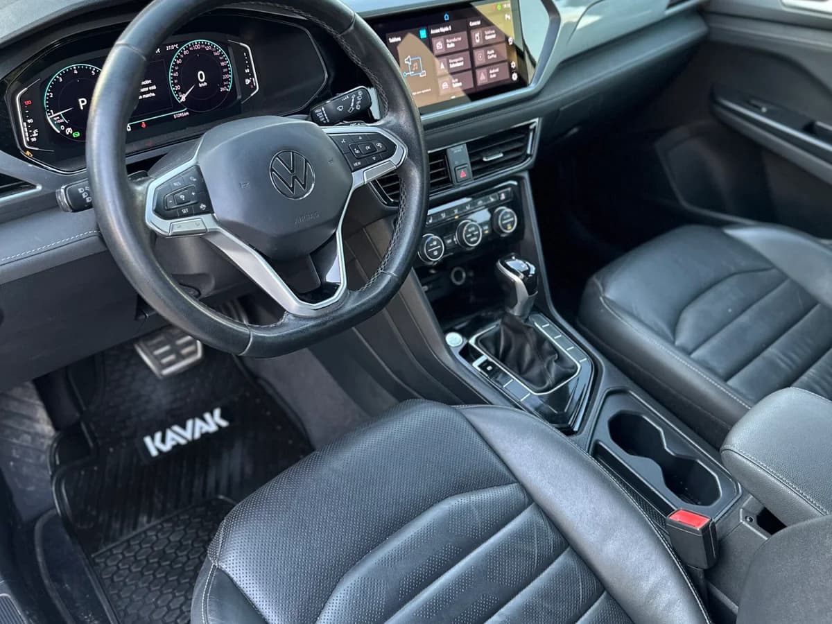 El Volkswagen Taos Highline 250 TSI AT Es un SUV que destaca por su diseño elegante, tecnología avanzada y seguridad. A continuación, te presento algunas de sus características más importantes: Diseño y Equipamiento Luces delanteras y traseras LED: Iluminación eficiente y diseño moderno. Cuadro de instrumentos digital: Pantalla de 10,25 pulgadas con información importante para el conductor. Radio Touchscreen de 10,1 pulgadas: Sistema de infoentretenimiento con VW Play y conectividad Apple CarPlay y Android Auto. Climatizador "Climatronic" de 2 zonas: Control de temperatura para conductor y pasajero. Techo panorámico: Amplia visibilidad y sensación de espacio interior. Tapiz en cuero Vienna: Asientos cómodos y elegantes. Seguridad Control Crucero Adaptativo (ACC) con Stop&Go y Front Assist: Ayuda a mantener la distancia con el vehículo de adelante y frena automáticamente en caso de emergencia. Detector de punto ciego: Alerta al conductor sobre vehículos en el punto ciego. Frenado de Emergencia Automático con detección de peatones: Frenado automático en caso de colisión con peatones. Airbags laterales y de cortina: Protección adicional para los ocupantes. Rendimiento y Eficiencia Motor 1.4 TSI: Potencia de 150 CV y torque de 250 Nm. Transmisión automática de 6 velocidades: Cambios suaves y precisos. Consumo de combustible: Hasta 13,7 km/l en ciclo mixto. Tecnología y Conectividad VW Play: Sistema de info entretenimiento con botones virtuales y conectividad absoluta. Cargador de teléfono celular inalámbrico: Carga sin cables.